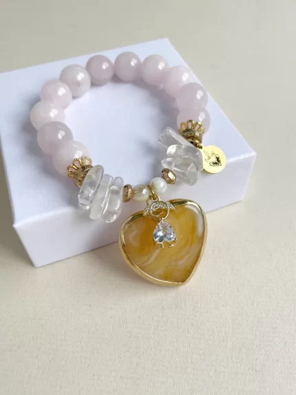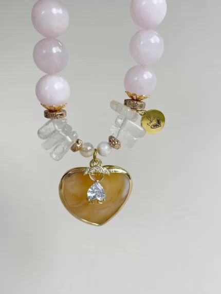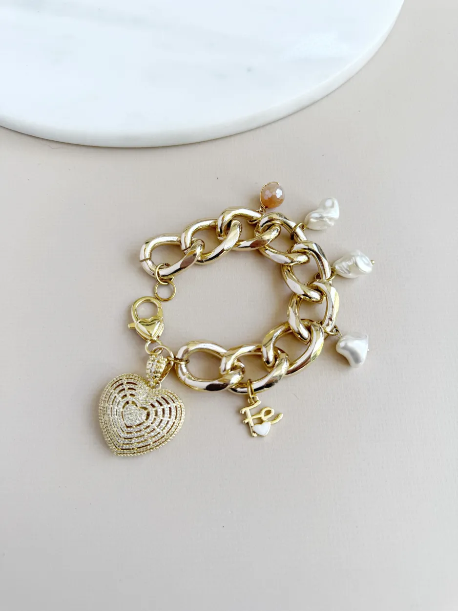 Pulsera elaborada de eslabón de baño de oro (no oxida) con perlas de nácar, ágata facetada y maxi dije de corazón de baño de oro con zirconias. Tiene un simbolismo especial con cada pieza: MI CORAZÓN ESTÁ CONFIADO PORQUE PADRE, HIJO Y ESPIRITU SANTO CUIDAN DE MI