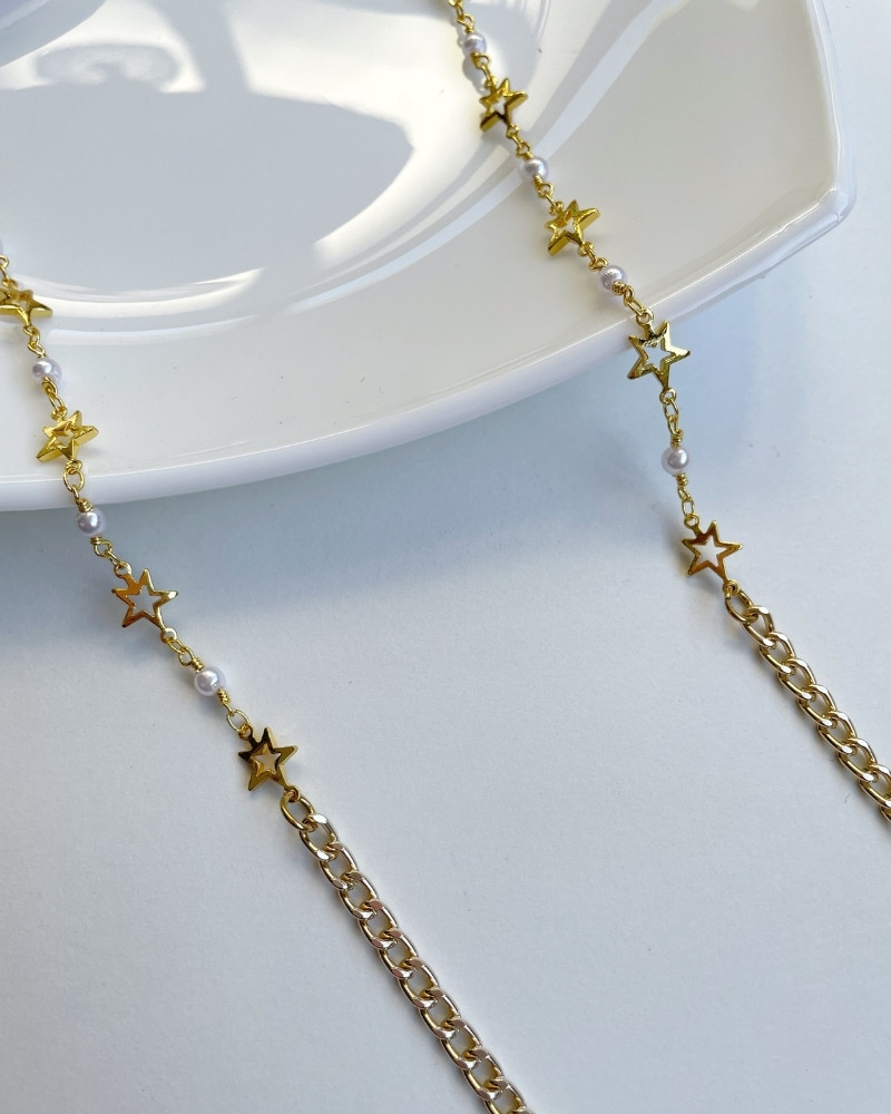 Elaborado con cadena de bronce y aluminio con baño de oro dorada. Se puede utilizar de distintas formas: como cadena para lentes, collar, pulsera, sujeta mascarillas, o adorno para el pantalón.