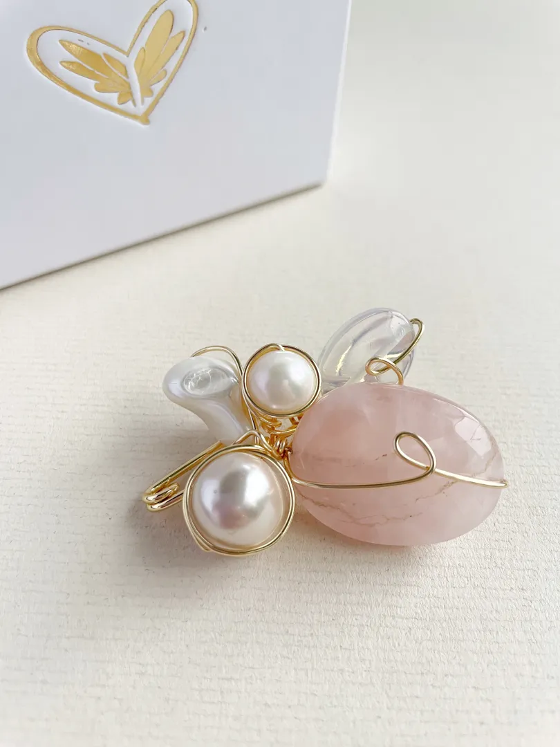 Broche elaborado a mano con la técnica de alambrismo. Elaborado con cuarzo rosa, perla cultivada, perla de nácar y ópalo. Medida 5 cm x 4 cm