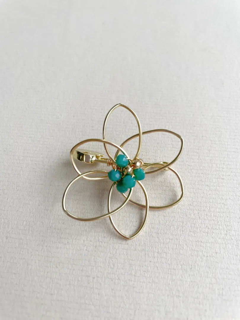 Broche elaborado a mano con la técnica de alambrismo, se utilizó alambre de cobre con baño de oro y cristales en tono turquesa. Medida 4 cm x 4 cm
