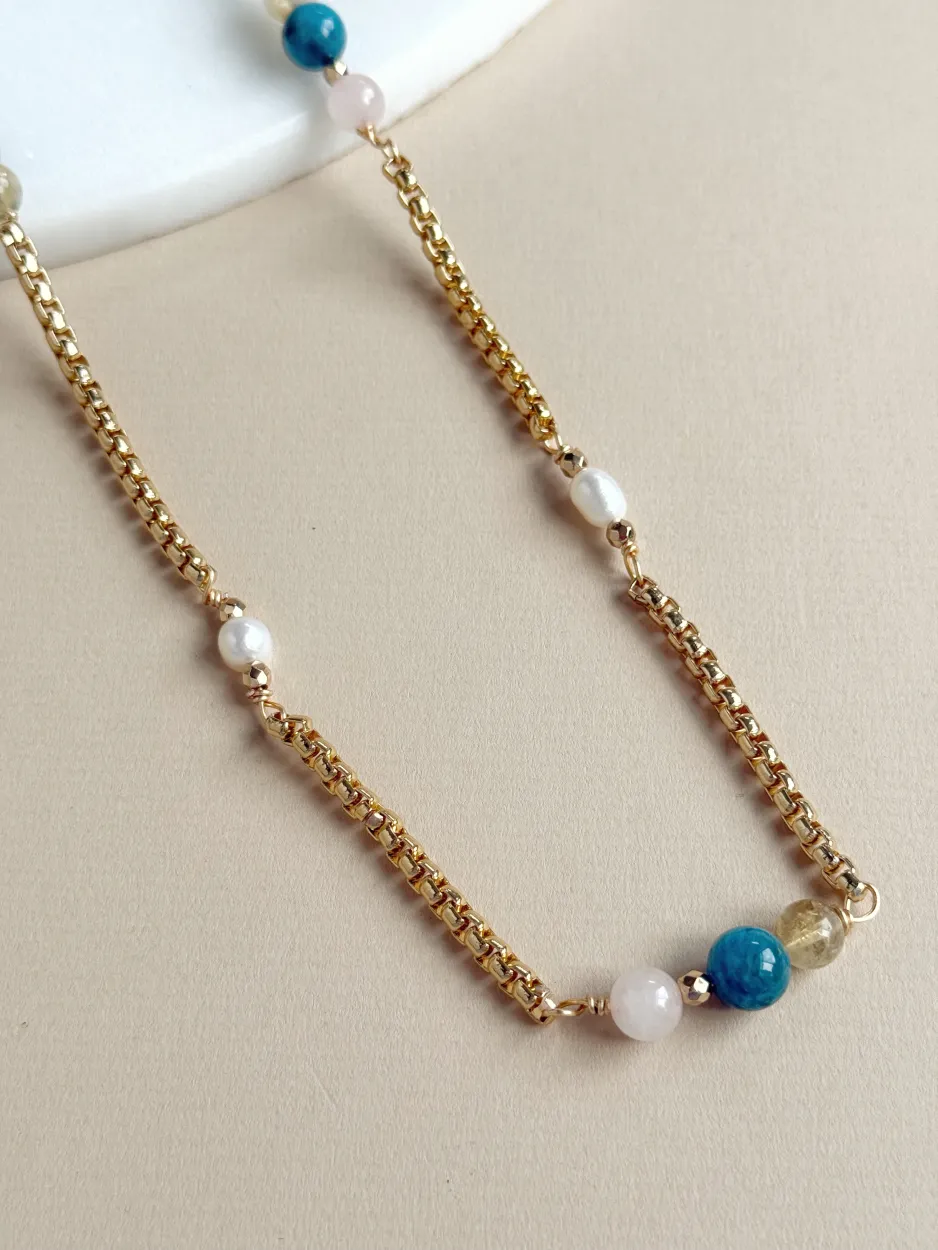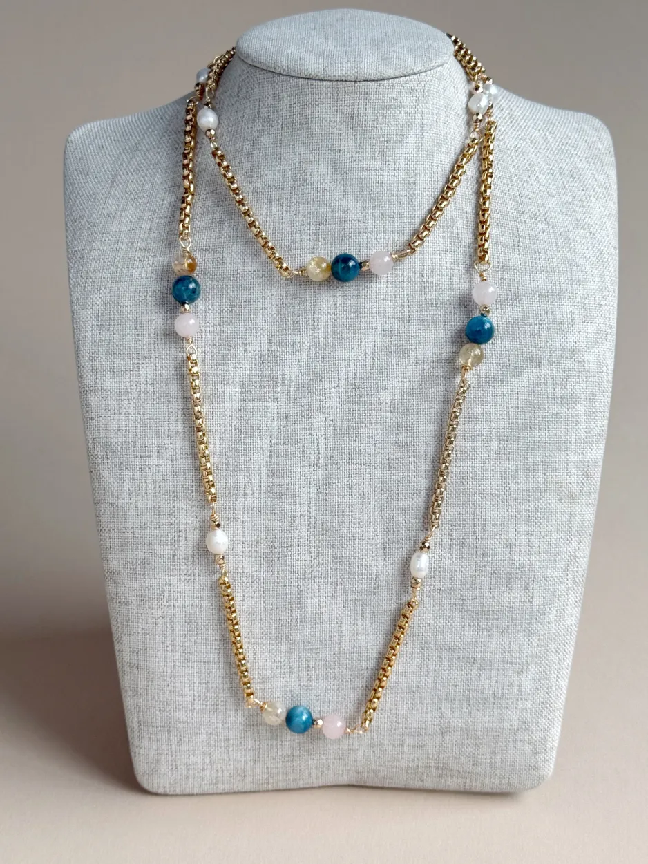 Collar largo de eslabón con baño de oro y piedras naturales de cuarzo rosa, apatita y cuarzo citrino, también tiene perlas cultivadas. Se puede usar largo, doble o como pulsera