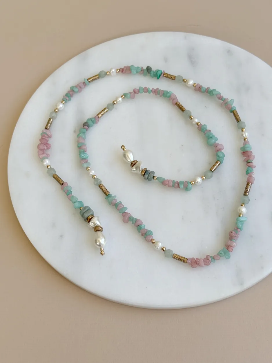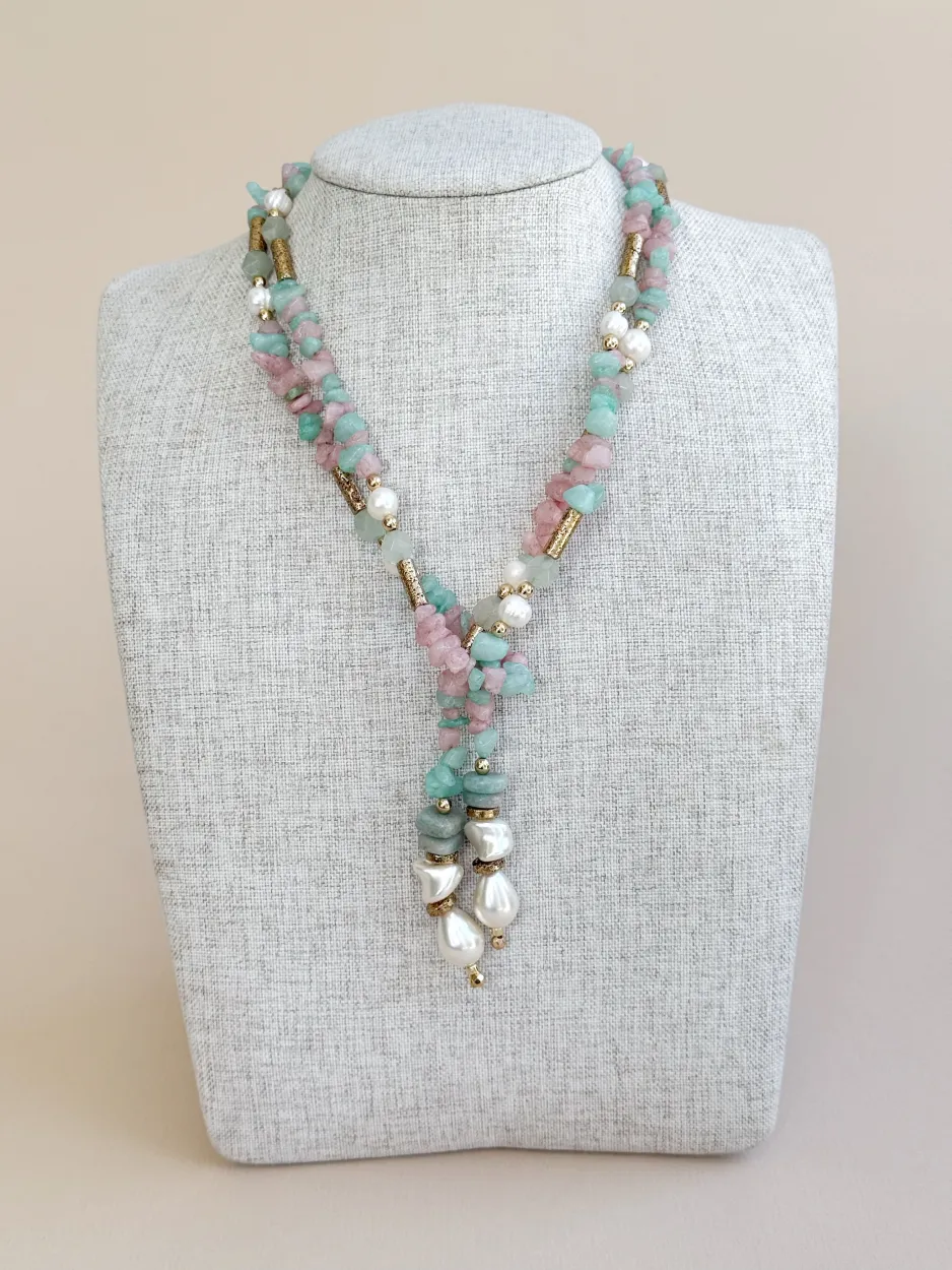 Cordón largo multi función, elaborado de hematites,cuarzo cherry, amazonita y perla de nácar. Se puede usar de varias maneras: collar largo, collar doble, collar doble cruzado o como cinturón