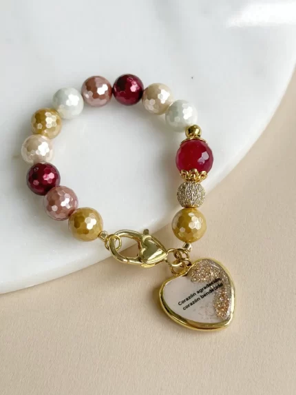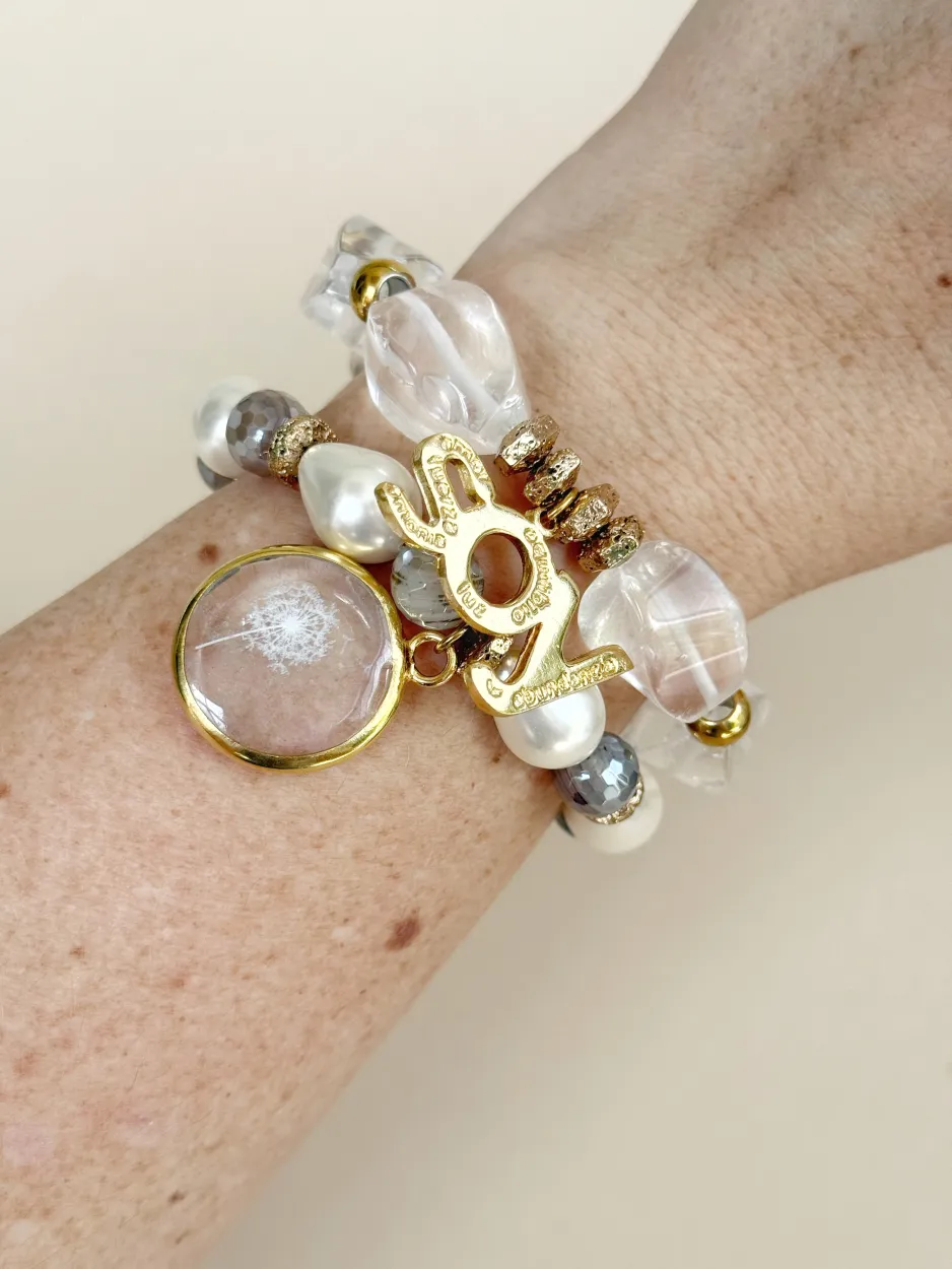 Pulsera elaborada de perla de nácar y ágata facetada, cadena de expansión para ajustar a la medida. Dije de murano transparente con Diente de León que simboliza los deseos y sueños, especialmente al soplar sus semillas. También representa la resiliencia, la esperanza, la fortaleza y la capacidad de superación, debido a su habilidad para crecer en condiciones difíciles.