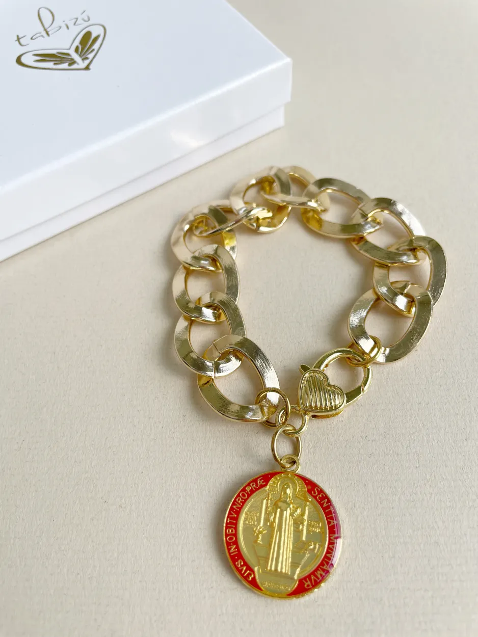 Pulsera elaborada de eslabón de aluminio con baño de oro, dije de medalla de San Benito (protección)