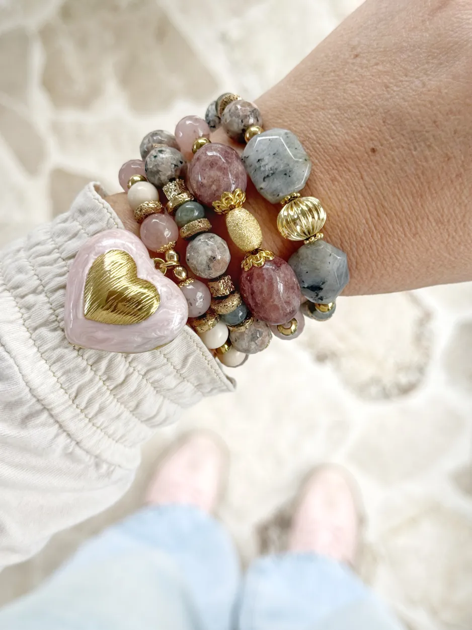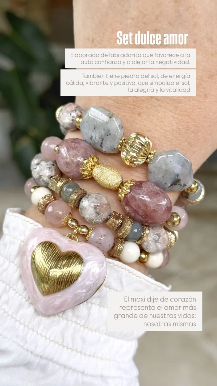 Set elaborado de 4 pulseras elásticas de labradorita (favorece la auto confianza y aleja la negatividad), también tiene piedra del sol (piedra de energia vibrante, cálida y positiva)