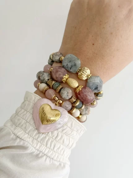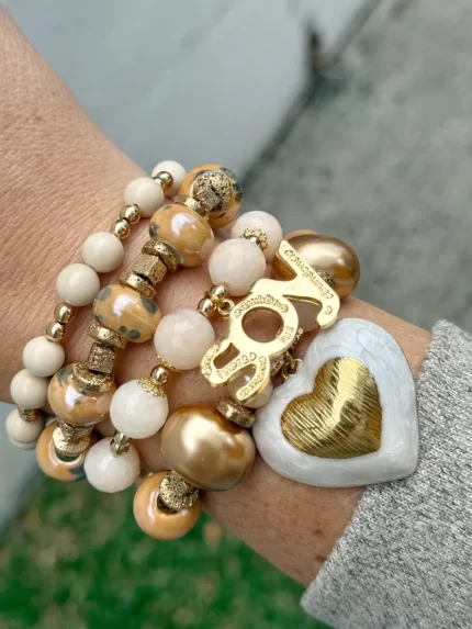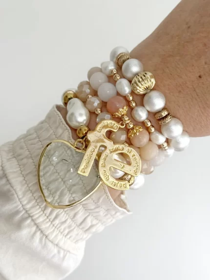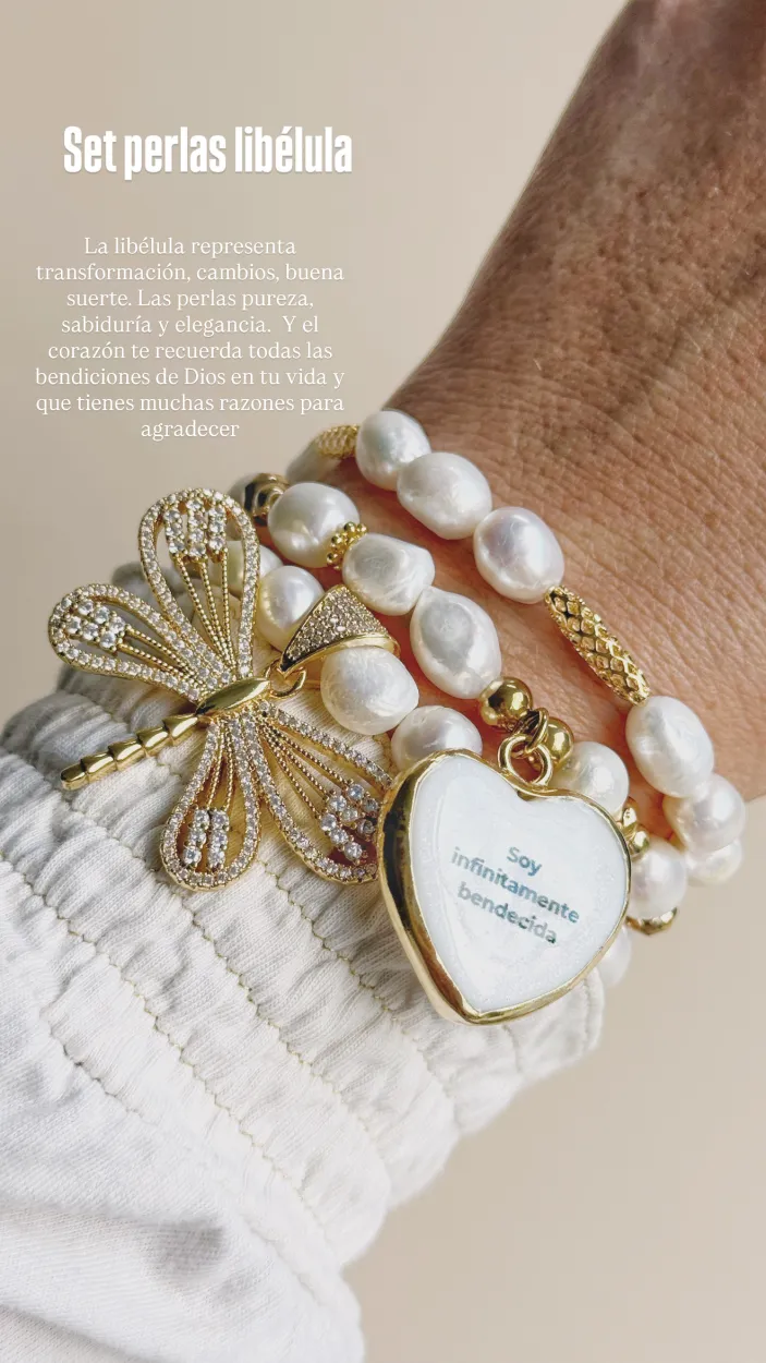 Set de tres pulseras elásticas elaboradas de perlas cultivadas, dije de libélula baño de oro con zirconias y corazón de murano con frase SOY INFINITAMENTE BENDECIDA