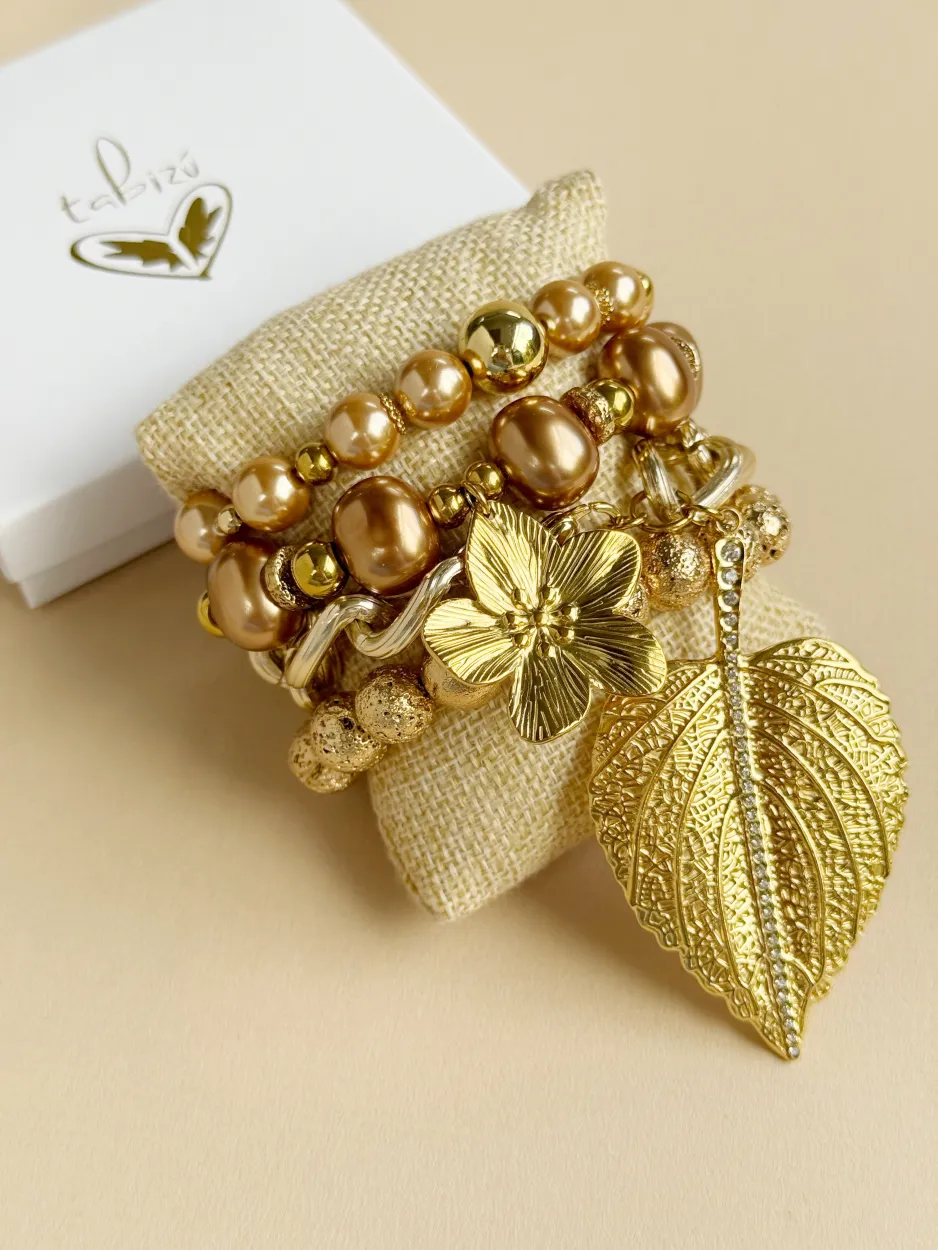 Set de 4 pulseras, 3 elásticas de perla de nácar, hematites y piedra volcánica baño de oro. Y una pulsera de eslabones baño de oro, no oxida. Maxi dije de hoja de acero inoxidable y dije de flor. Lo d